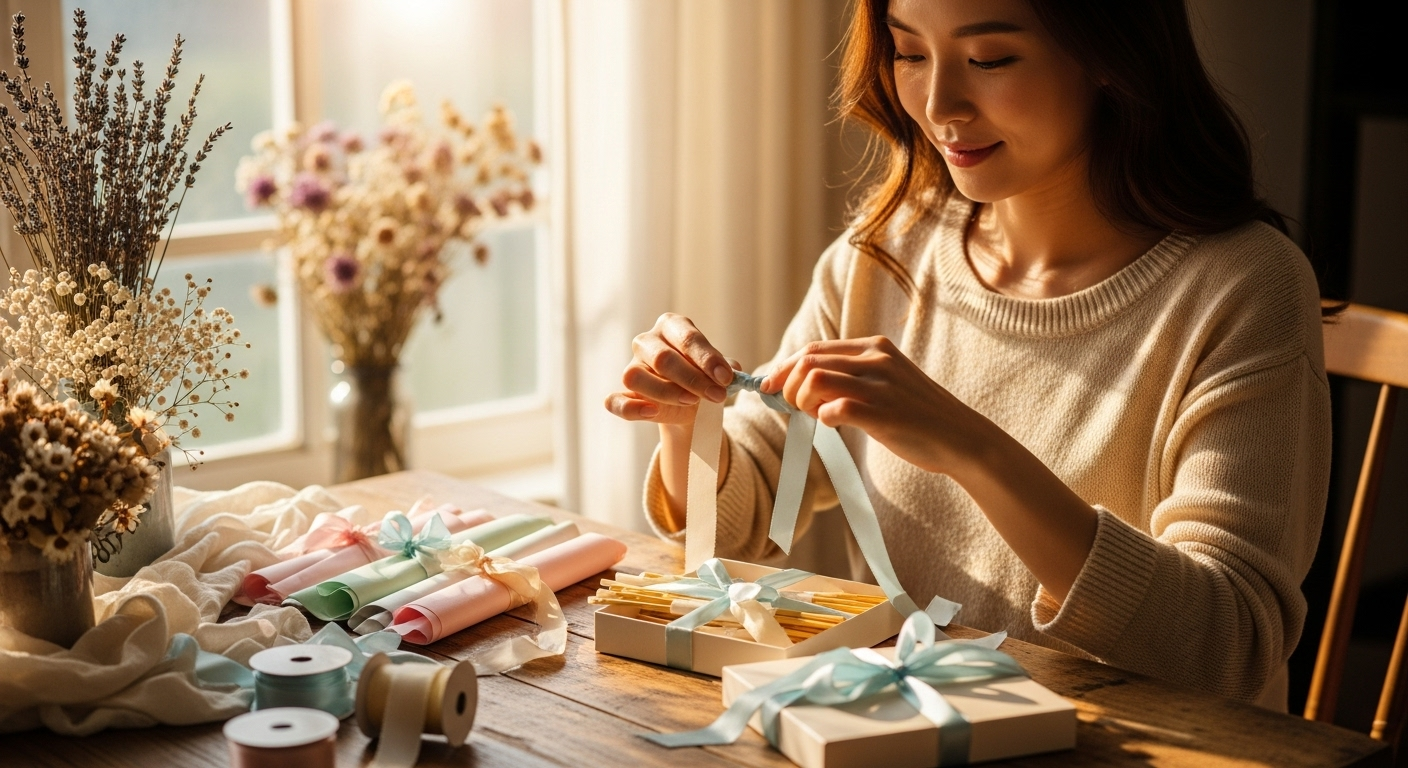 디테일 소품: 새틴 리본(10mm/16mm), 그로그랭(광택↓), 코튼 트와인(내추럴), 얇은 주얼리 체인(메탈 포인트), 미니 드라이 라벤더/라그라스, 원형 크래프트 스티커(지름 30mm). 조합은 ‘광택 1 + 매트 2’가 기본 균형입니다.